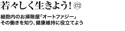 私たちの体は約37兆個の細胞でできているといわれ、細胞1個1個が自らを若々しく保つために日々メンテナンスをしているのです。この仕組みを「オートファジー」と呼び、解明した大隅良典博士は2016年にノーベル生理学・医学賞を受賞しました。私たちが細胞から若々しく、元気に生きていくために、オートファジーは大変重要な働きをするのです。