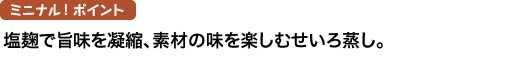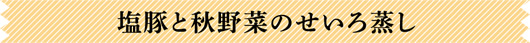 せいろ蒸しは、お好みの材料を入れて蒸すだけなのでヘルシーな上に調理も簡単、素材そのものの味を楽しめます。秋野菜としてカボチャやさつま芋、牛蒡などを加えても美味しくいただけます。
