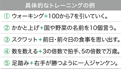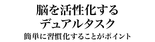 具体的には、歩きながら計算をする、家事をしながら歌を歌う、ストレッチをしながら今日の予定を思い出す、また、右手で四角を描きながら左手で三角を描く、右手はグーパーしながら左手は数を数える、などの作業です。