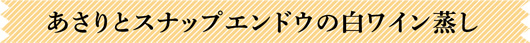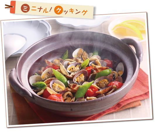 - B 白ワインを回し入れ、蓋をしてあさりの口が開くまで蒸す。スナップエンドウ、ミニトマトを加え、蓋をして約3分蒸す。